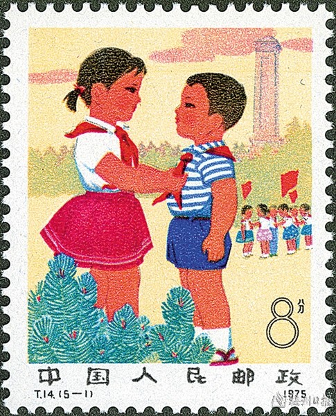 1975年12月1日, 原邮电部发行的《新中国儿童》特种邮票的第一枚“授红领巾”(图③),图案中授红领巾的两个小朋友远方的树丛中耸立着人民英雄纪念碑,象征新中国少年儿童继承革命先烈遗志,当好共产主义接班人。