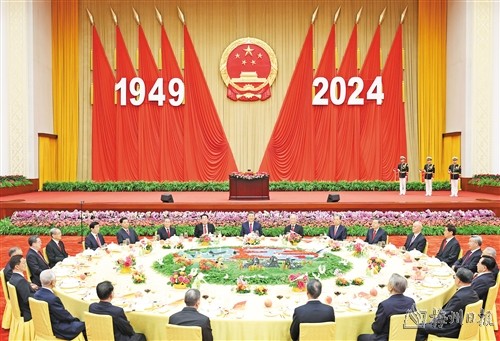 人民大会堂宴会厅华灯璀璨,洋溢着喜庆热烈的节日氛围。主席台上方高悬着庄严的国徽,“1949-2024”大字年号在鲜艳红旗映衬下格外醒目。