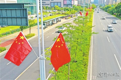 本报讯 (记者何梓瑜)今年是中华人民共和国成立75周年。伴随着国庆节临近,梅州城区的节日氛围渐渐浓烈,大街小巷齐换“红装”,一面面鲜艳的五星红旗迎风飘扬。