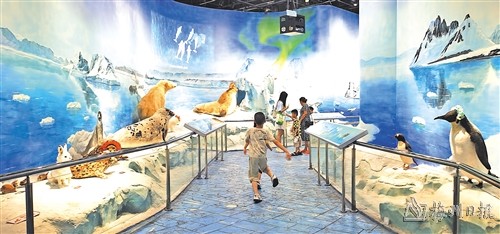 我们首先来到海陆探秘展区,这是一个适合3至7岁年龄层儿童体验的区域。展区以“海丝路探秘”为故事主轴,让小朋友们通过繁华的刺桐港,跟随“郑和宝船”,途经神秘的“丛林岛”“钻石谷”及“鲸鱼岛”,历险之后满载而归回到“九州城”。从海陆展区出来,逐层而上,可先后来到生命健康、智慧天地、科技时代、太空探索、防灾减灾等展区。因为时间有限,对元和南比较抽象的展区我们只是走马观花,没有过多地停留,但留有悬念,或许才是游行的最高境界。
