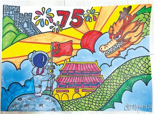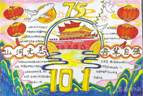 为庆祝中华人民共和国成立75周年,引导少年儿童厚植爱党、爱国、爱社会主义的情感,我市各中小学校开展了形式多样的庆国庆活动,中小学生纷纷为国庆节创作了许多书画、文字作品,本报特挑选了其中的优秀作品刊登, 让孩子们用手中的笔表达对祖国的祝福和深深的爱国之情。