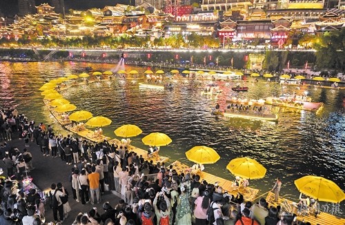 10月3日,游客在湖北省恩施土家族苗族自治州宣恩县城贡水河上乘坐竹筏赏夜景。