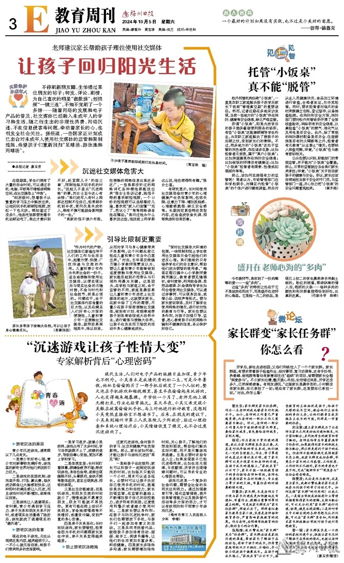 “作为时代的产物,社交媒体已普遍应用于人们的工作与生活当中,起着方便、快捷、广泛传递与交流的作用。儿童和青少年作为未来社会的一份子,适当地接触和使用社交媒体,以便实现以后与现实社会的无缝对接,不会与时代和社会脱节,那是必须的。问题在于,由于社交媒体内容含量的巨大性,以及在满足人们好奇心方面的便捷性,儿童和青少年一旦接触社交媒体,就很容易深陷其中,难以自拔,从而对学习与身心健康带来不良影响,这个问题此前已经在儿童和青少年当中凸显出来。” 对此,五华县安流镇万塘小学教师陈赞发认为,要让儿童和青少年能够做到适度接触与使用社交媒体,家长能否起到示范带头与引领作用最为关键。这是因为,在学校与家庭之间,由于监管的不同,家庭是最容易让儿童和青少年迷恋上社交媒体的地方,这就要求家长,在家中除了工作的需要,尽量少在孩子面前接触社交媒体,做到有计划、有规律地带孩子到体育场馆或大自然中去,进行锻炼与接触大自然,让孩子在充实而又愉悦的活动中身心健康地成长。