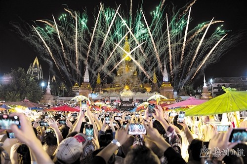 10月4日,游客在云南省西双版纳傣族自治州景洪市告庄西双景景区观赏国庆烟花秀。