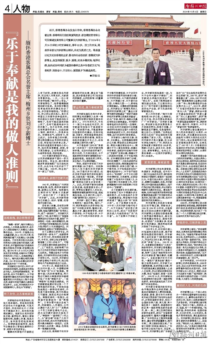 近日,香港客属总会发出讣告称,香港客属总会名誉主席、香港特别行政区铜紫荆勋贤、新宝德投资有限公司及精通发展有限公司董事长刘宇新博士,于2024年8月26日深夜3时安详离世,享年83岁。因工作关系,笔者很早就与刘宇新博士相识,并成为莫逆之交。笔者谨以此文纪念香港实业家、著名的社会活动家、慈善家刘宇新博士,他坚持爱国、爱乡、爱港,终身乐善好施、福泽社群,他的成功和对家乡祖国的善举正是中华客家文化“吃苦耐劳、艰苦奋斗、不忘初心、爱国爱乡”的最佳典范。