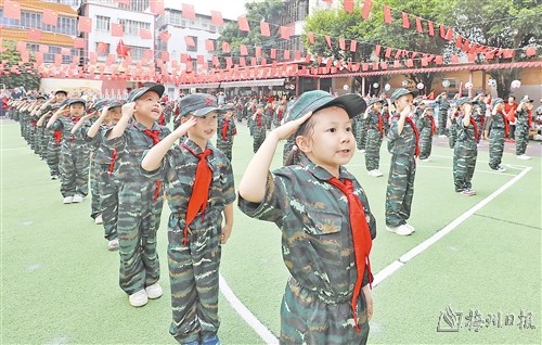 本报讯 9月27日下午,在梅州市文玉幼儿园运动场上,号角吹响、军歌嘹亮,大、中班幼儿化身小战士,穿着迷彩服英姿飒爽,迎来了该园“小小英雄梦”爱国主义教育主题活动的结营仪式,献上了一场精彩的结营汇演。