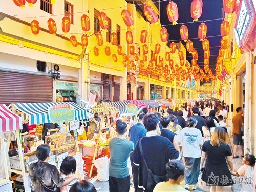 10月1日至3日,在梅江区嘉应古城,客家非遗美食文化荟精彩不停,有的游客看演出、逛集市、品美食、与身着传统服饰的NPC互动,还有的游客身穿客家服饰、汉服、旗袍等打卡拍照,全方位感受非遗文化热潮。“显眼包美食”摊位负责人叶宇豪说:“我们摊位有客家娘酒鸡、客家腌面、猪杂肉丸汤等。最受欢迎的是客家娘酒鸡,一碗18元,1号下午4时出摊,到晚上7时就卖完了,展销情况比预期好得多了!”