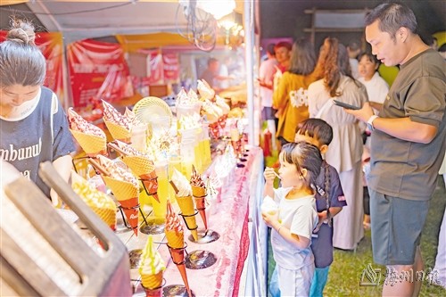 在三圳镇乡村音乐节开幕式的户外草坪现场,夜市渐渐苏醒,五彩斑斓的霓虹灯交织出一幅绚烂的画卷。烧烤、臭豆腐、冰淇淋、糖画……各色美食摊位间,人潮涌动,空气中弥漫着美食的香气,同时各式各样的游乐项目也琳琅满目,游客们沉浸其中,玩得不亦乐乎。