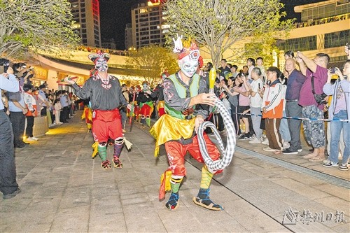 咚咚咚、咚咚咚……伴随着灵活的步伐、精美的脸谱、铿锵有力的鼓声,来自汕尾陆丰的英歌舞登上“国韵悠长”——寿乡专场音乐晚会舞台。“这次演出比较特别,正好碰上国庆节,给祖国母亲庆生,当地观众都特别热情,现场氛围很好。”汕尾陆丰英歌队的青年队员肖志勇告诉记者,此次表演团队共有107人,他们在蕉岭一共演出了3场,之前还到广州、西安、北京等地进行了巡演。
