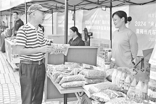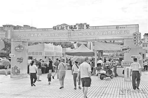 活动现场设置8大分区,分别为新能源汽车展、家电“以旧换新”惠民购、“米香酒”品鉴区、农特产品展销、服装百货展销、人气网红美食、亲子游玩区、凭高铁票领取消费券服务台。展位上,商品种类丰富,米香酒、汽车、家电、摩托车、电动车、农特产品等应有尽有。活动期间,消费者凭2024年9月15日之后抵达梅州的纸质版高铁票(抵达梅州西站、兴宁南站、五华站、丰顺站的票均可)可领取消费券用于现场消费。