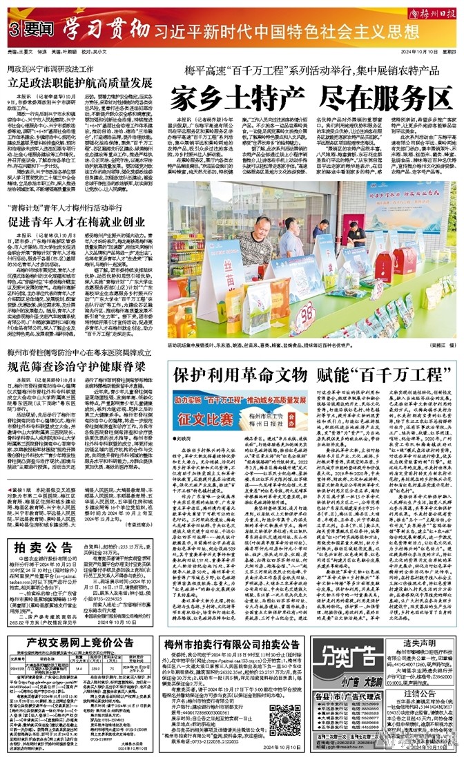 本报讯 (记者杨乔颖)今年国庆假期,广东梅平高速有限公司在平远服务区和蕉岭服务区举办梅平高速“百千万工程”系列活动,集中展销平远和蕉岭两地的农特产品,吸引众多过往旅客选购,为乡村振兴注入新动能。