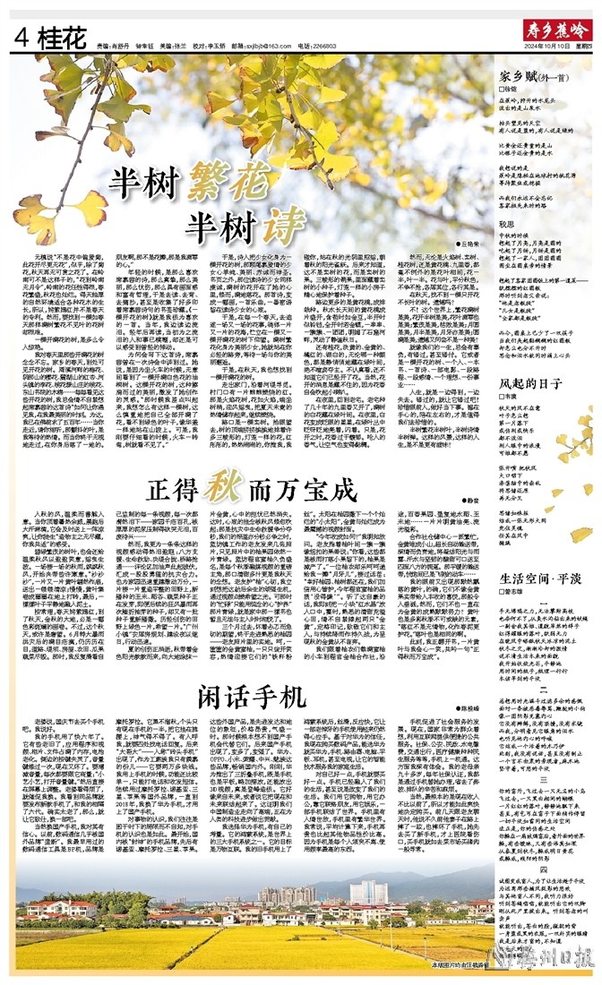 还有桂花,淡黄的、金黄的、橘红的、银白的,无论哪一种颜色,都是静悄悄地藏在绿叶间,绝不喧宾夺主。不认真看,还不知道它们已经开了花。当然,花开的消息是藏不住的,因为花香自会吹起小喇叭。
