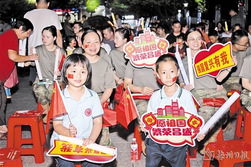 国防教育要走向社会大舞台,直面群众、深入群众、服务群众。国庆前夕,梅城八一公园灯光璀璨,梅州军分区举办“传承红色基因 强国强军有我”为主题的开放式红色故事展演晚会,吸引周边上千群众自发前往观看。晚会以红色故事为主线,穿插红色歌曲、诗歌朗诵和舞蹈演绎。红色故事讲解员小分队讲述梅州12张红色名片背后的革命故事,再现三河坝战役、九月来信等革命历史,以及革命战争时期无数梅州儿女抛头颅、洒热血的英雄事迹。观众一边挥舞国旗一边认真欣赏表演。晚会在军民同唱《歌唱祖国》的铿锵歌声中圆满谢幕。不少观众纷纷表示,今天的幸福生活离不开强大的国防,一定要铭记历史、缅怀先烈,为祖国的繁荣富强贡献自己的力量。