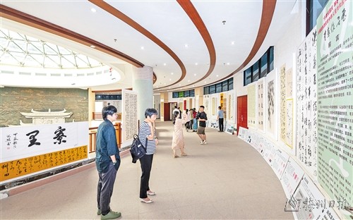 记者在展览现场看到,一幅幅精美的书画作品整齐有序陈列在走廊上,书法作品结构工整,笔画或苍劲有力、或柔中带刚;国画作品构思精妙,栩栩如生,吸引了不少市民前来观赏。