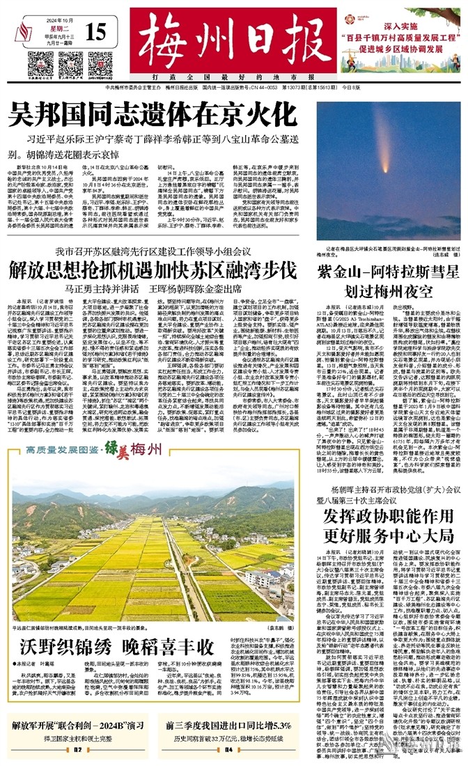 本报讯 (记者连志城)10月12日,备受瞩目的紫金山-阿特拉斯彗星(C/2023 A3 Tsuchinshan-ATLAS)最接近地球,迎来最佳观测期。10月13日,日落后不久,记者在梅县区大坪镇尖石笔景区观测到该彗星划过梅州的夜空。