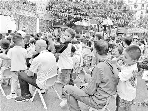 重阳节当天,在宁新街道曙光社区党委与新太阳幼儿园党支部联合举办的“九九重阳,童心敬老”党组织联建活动中,参加活动的老年人惊喜连连,现场欢笑声不断。
