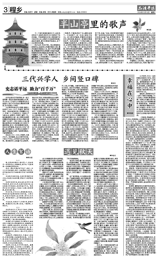 一曲完毕,我双手将麦克风奉还给老人家,便和他闲聊了几句。他说自己是一名曾参加过自卫反击战的转业军人,今年已八十有五,经历过枪林弹雨后转业回到家乡,从单位退休后就喜欢清净,不爱去公园那些人多的地方“显摆”。“偶尔想吼几声就寻找偏僻的幽静处自娱自乐,不扰民、也不尴尬。”我终于明白了他为何对军旅歌曲情有独钟。此时,一片秋叶以从容的姿态随风飘下来,轻轻落在亭外的青石台阶上。老人家凝视着这片沉淀了岁月静默清欢也安然的秋叶,自言自语地淡淡说道:“做不了什么大事,就做点自己喜欢的事。”没有刻意去雕饰自己的爱好,老人家豁达乐观的样子,像极了秋天的爽朗,让人顿生好感。