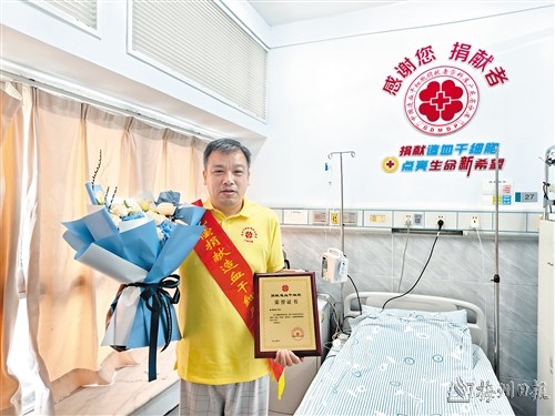 本报讯 (记者林晓萍 通讯员钟国和)16日,在市红十字会工作人员的协调下,捐献者余泽武在汕头大学医学院第一附属医院成功捐献造血干细胞,成为中国造血干细胞捐献者资料库广东省管理中心梅州工作站第40例捐献者以及广东省第2112例非亲缘造血干细胞捐献者(如图,市红十字会提供)。