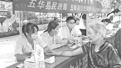 五华县民政局联合五华县卫健局、中国人寿保险公司举办了以“坚持以老年人为中心,构建老年友好型社会”为主题的重阳节主题活动。在横陂镇球王广场,来自五华县慢性病防治站的医疗专家团队为老年群众提供免费医疗服务,悉心解答他们的健康咨询。同时,志愿者们向老年人宣传普及相关免费惠民保险政策,让他们的晚年生活多一份坚实保障。