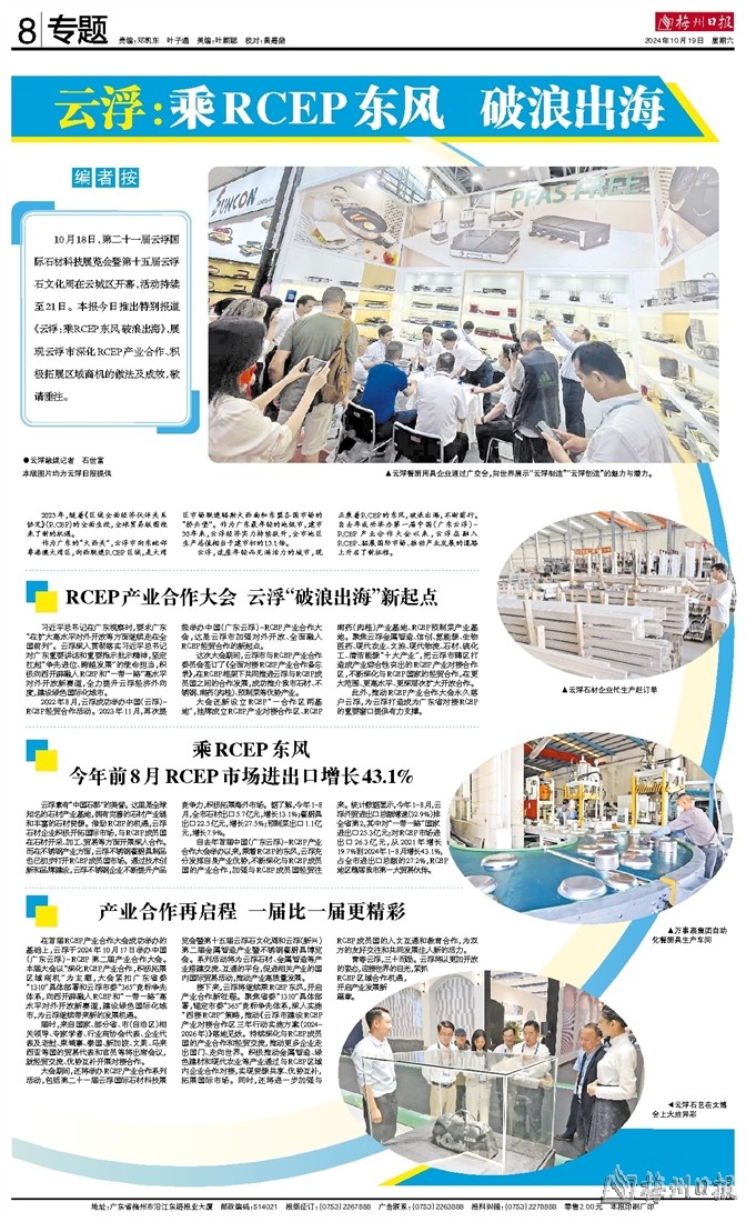 10月18日,第二十一届云浮国际石材科技展览会暨第十五届云浮石文化周在云城区开幕,活动持续至21日。本报今日推出特别报道《云浮:乘RCEP东风 破浪出海》,展现云浮市深化RCEP产业合作、积极拓展区域商机的做法及成效,敬请垂注。