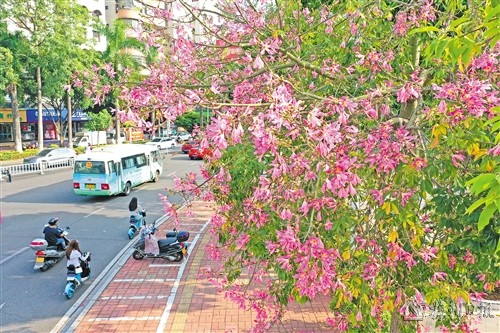 本报讯 (记者李艳良)10月下旬,梅城街头的美丽异木棉迎来花期,云霞般的粉红色花朵缀满枝头,成为秋日里一抹抹靓丽的景致。