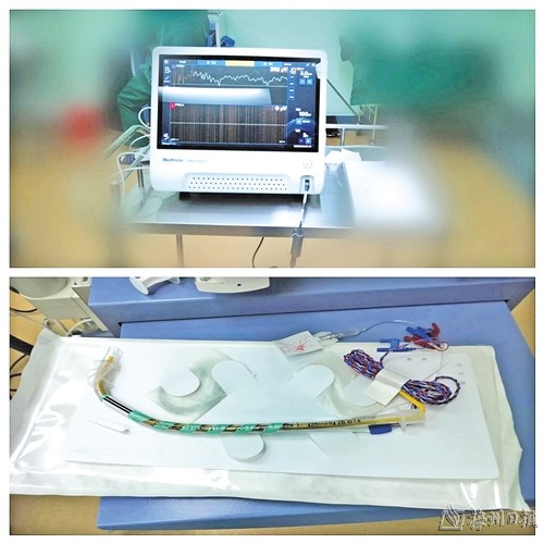 2023年11月25日下午4时,龙淼云教授为凌姐主刀手术。在麻醉医师的熟练配合下,手术顺利进行。当手术进行到喉返神经的“藏身部位”时,龙教授团队使用了一次性神经探头进行“排雷”作业。随着监测到的微电流,神经监测仪不断发出“嘟嘟嘟”的警报声,喉返神经被完美地识别出来,并得到了有效的保护。