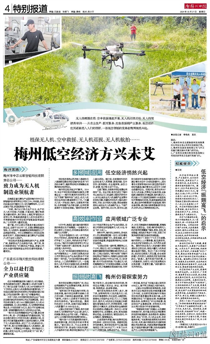 “梅州是个文化底蕴深厚的城市,旅游资源丰富,低空经济市场非常有潜力。”曾永颂认为,可以从政策支持和规划引导、资金投入和技术创新、人才培养和引进、释放低空解放生产力等方面努力,结合梅州自身的优势,将低空应用融入到农业、林业、城市管理、物流配送、旅游等领域。