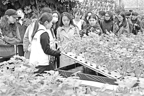 图为10月26日,参观者在杨凌现代农业创新园了解深液流水培技术。
