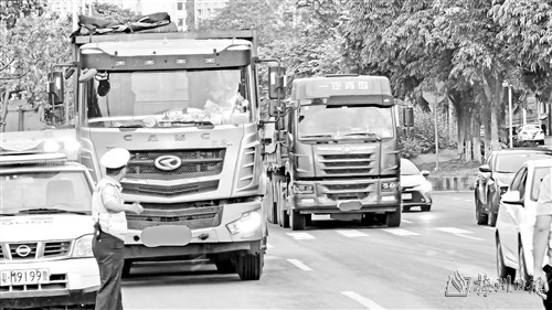 在查处过程中,记者发现除闯红灯违法行为比较突出之外,不少大货车会在禁止通行时间进入环市路,执勤民警依法依规对这些驾驶员进行了处罚。