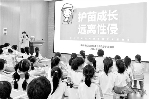 本报讯 (记者张莹娜 通讯员陈诗琦)日前,梅江公安女子护苗编队走进梅江区鸿都小学,分别为三、四、五年级的女学生带来三场精彩纷呈的预防性侵主题法治宣讲课(如图,梅江公安供图),进一步提高青少年的法治意识和自我保护意识,保护未成年人合法权益,推进平安校园建设。