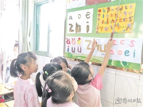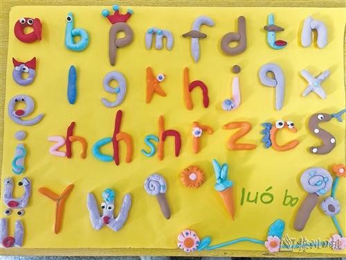 对于一年级的新生,我提倡快乐学习,并把“学海无涯乐作舟”作为教学目标。进行了几周的拼音教学后,为了让孩子们记得更牢,我布置了一项特色练习,就是让他们摆拼音字母。孩子们兴味盎然,分别用黏土、花生壳、树叶、豆子、牙签等作为材料,摆出了各式各样的字母宝宝,创意满满,真正体验了“学中玩,玩中学”的快乐。图为108班的孩子们在展示自己的手工作品。