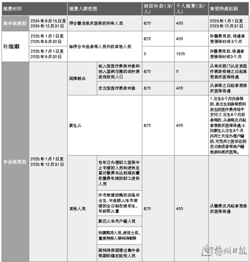 2025年梅州市城乡居民医保缴费标准一览表
