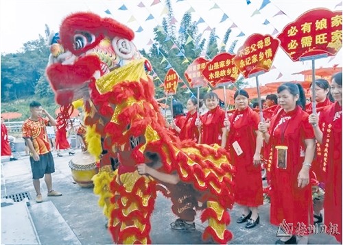 活动当天,琴口村告岭片外嫁女们在舞狮队的带领下,手举牌匾、或肩挑礼担、或撑着油纸伞(如右图),行走在回娘家的路上,感受着家乡新变化。