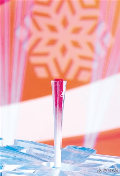 火炬顶部出火口位置采用花蕊镂空造型与丁香花造型结合,形成具有立体感的出火口;上部燃烧舱外壁选取镂空雪花作为造型元素;外壳设计为一朵蓬勃盛开的丁香花,采用透明冰晶到雪花白的渐变;内芯色彩采用中国红到丁香紫的渐变。火炬在点燃时呈现出冰与火交融的效果,突出冰雪运动在挑战与激情中迸发的光彩。