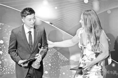 图为10月30日,马龙(左)与同获杰出运动生涯奖的女运动员、新西兰皮划艇运动员丽萨·卡灵顿在颁奖典礼上。(新华社发)