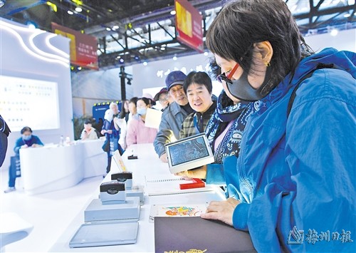 图为参观者在博览会上“护照”盖章处加盖纪念章。