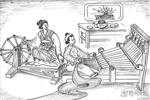 织布师傅又如何,脚踏楠机手抛梭。 牵得绉纹入簆齿,羹糊上刷用钩拖。 点评:客家乡村有人织布。织布的机子叫楠机。脚踏楠机,经纱在一开一合中输出,再用梭子带动纬纱在上下开合的经纱开口中穿过,便织成布。“牵得绉纹入簆齿,羹糊上刷用钩拖”,说明织的布密度大,质量好,织布师傅手巧。 |
