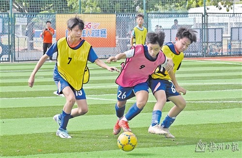图为U12梅州广电队队员(中)带球突破。(李盛华 摄)