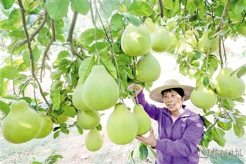 走进雁洋镇大坪村柚子种植基地,记者看到一株株柚树整齐排列,处处散发着柚子的芳香,沉甸甸的柚子压满枝头,柚农们穿梭在柚林中,忙着采摘柚果。“现在不像以前那样只追求产量,首先是要保证柚子好吃,再考虑果型、产量,所以我不会太早采摘,在霜降以后视柚子成熟度再开始陆续采摘。”种了30多年柚树的绿家园农场主杨小庆说,经农业部门测算,今年他家柚树的亩产量达11903斤。