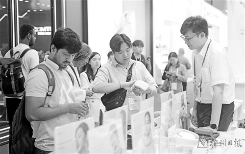 11月4日,客商在广交会上参观选购颈部按摩仪。