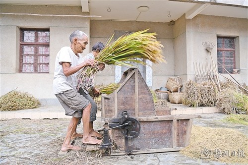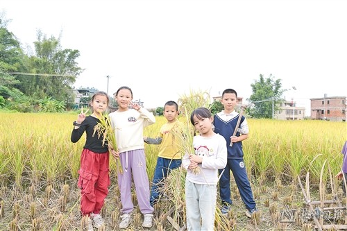 在打谷机旁,孩子们争先恐后拿起稻穗,脚踩机器,看到稻谷脱落在地上,慢慢堆积如山,成就感油然而生,孩子们都笑得合不拢嘴。