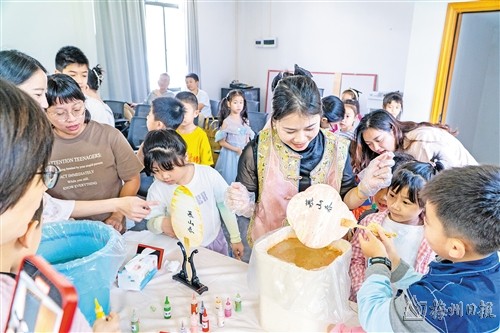 “漆扇是由我国一项古老的非遗技艺——大漆工艺创新而来的艺术作品……”在漆扇体验环节,老师首先为大家介绍了漆艺的悠久历史。随后,小朋友们在工作人员的指导下,将喜欢的漆料滴到清水中,轻轻搅拌之后将空白扇面缓慢浸入,制作出一个个极具“中式浪漫”的漆扇作品。“妈妈,送给您!”现场,孩子们兴奋地与家长分享制作心得、展示手工成果,亲子间的默契与感情得到进一步凝聚。