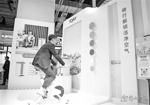 11月5日,一名男子在进博会消费品展区参与“骑行解锁清洁空气”活动。