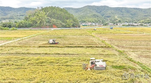 眼下,俯瞰蕉岭乡村沃野,风吹稻浪,农机穿梭,金黄色的稻田和农民忙碌的身影,共同绘制出一幅幅生动绚丽的丰收画卷。