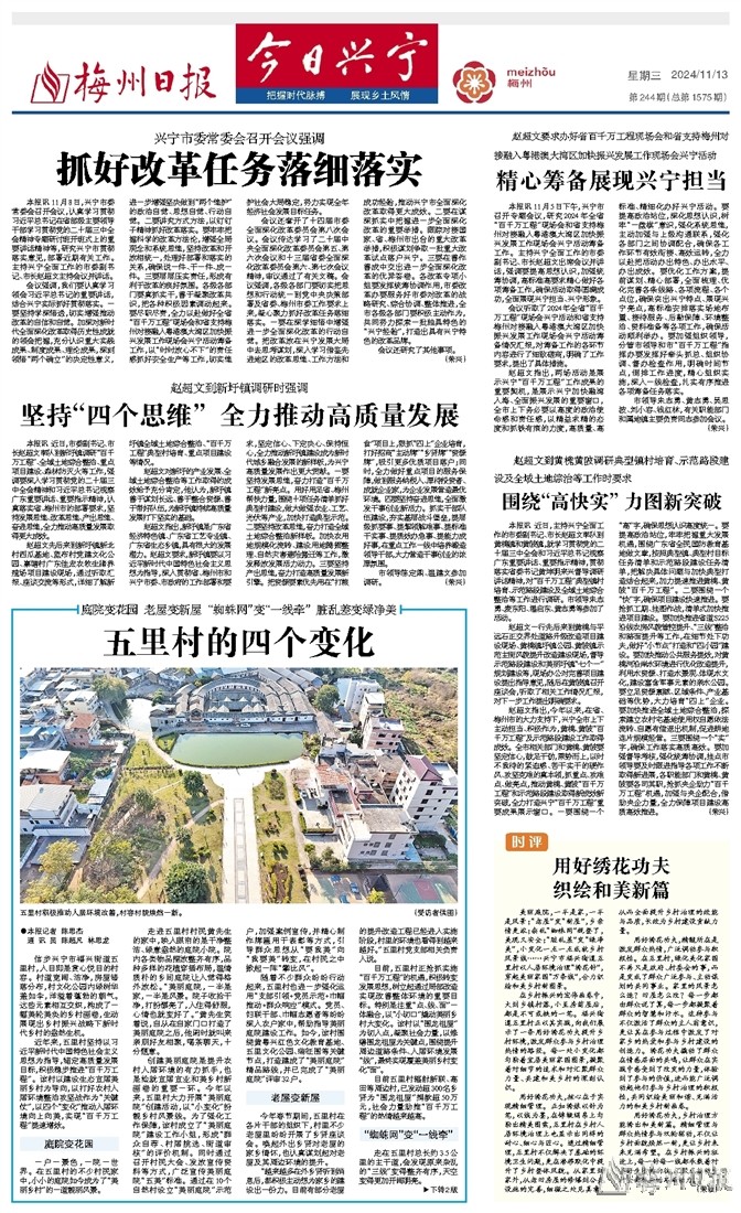 赵超文指出,今年以来,在省、梅州市的大力支持下,兴宁全市上下主动担当、积极作为,黄槐、黄陂“百千万工程”及示范路段建设工作取得成效。全市相关部门和黄槐、黄陂要坚定信心,鼓足干劲,乘势而上,以时不我待的紧迫感、苦干实干的硬作风、攻坚克难的真本领,抓重点、攻难点、做亮点,推动黄槐、黄陂“百千万工程”和示范路段建设取得新成效新突破,全力打造兴宁“百千万工程”重要成果展示窗口。一要围绕一个“高”字,确保思想认识高度统一。要提高政治站位,牢牢把握重大发展机遇,围绕广东省全民国防教育基地做文章,按照典型镇、典型村目标任务清单和示范路段建设任务清单,把解决具体问题与加快典型打造结合起来,加力提速推进黄槐、黄陂“百千万工程”。二要围绕一个“快”字,确保项目建设快速推进。要抢抓工期、挂图作战,清单式加快推进项目建设。要加快推进省道S225沿线农房风貌管控提升、“三线”整治和路面提升等工作,在细节处下功夫,做好“小节点”打造和“四小园”建设。要加快推动公共服务提效,对黄槐河沿岸水环境进行优化改造提升,利用水资源、打造水景观、体现水文化,建设富含军事元素的亲水公园。要立足资源禀赋、区域条件、产业基础等优势,大力培育“四上”企业。要加快推进全域土地综合整治,探索建立农村宅基地使用权自愿依法流转、自愿有偿退出机制,促进耕地连片规模经营。三要围绕一个“实”字,确保工作落实高质高效。要加强督导考核,强化统筹协调,挂点市领导要及时跟进指导各项工作不断取得新进展,各职能部门和黄槐、黄陂要各司其职,抢抓央企助力“百千万工程”机遇,加强与央企配合,借助央企力量,全力保障项目建设高质高效推进。(荣兴)