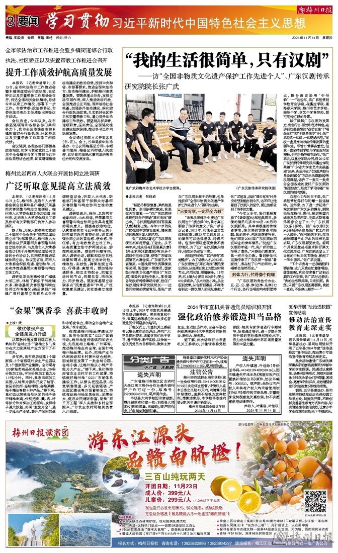 “广东汉剧的角色分为生、旦、丑、公、婆、净(红净、乌净)七个行当,各行当唱腔均有明显特点,舞台语言沿用‘中州韵’……”这些年,张广武经常到学校开设讲座,在嘉应学院、星海音乐学院、梅州市艺术学校、梅州中学、学艺中学等院校,都可见他忙碌的身影。