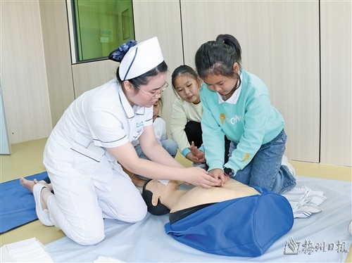 在培训中,医护人员手把手传授单人心肺复苏术、AED、气道梗阻急救处理等三种急救技能,让参加培训的青少年近距离学习急救技能。