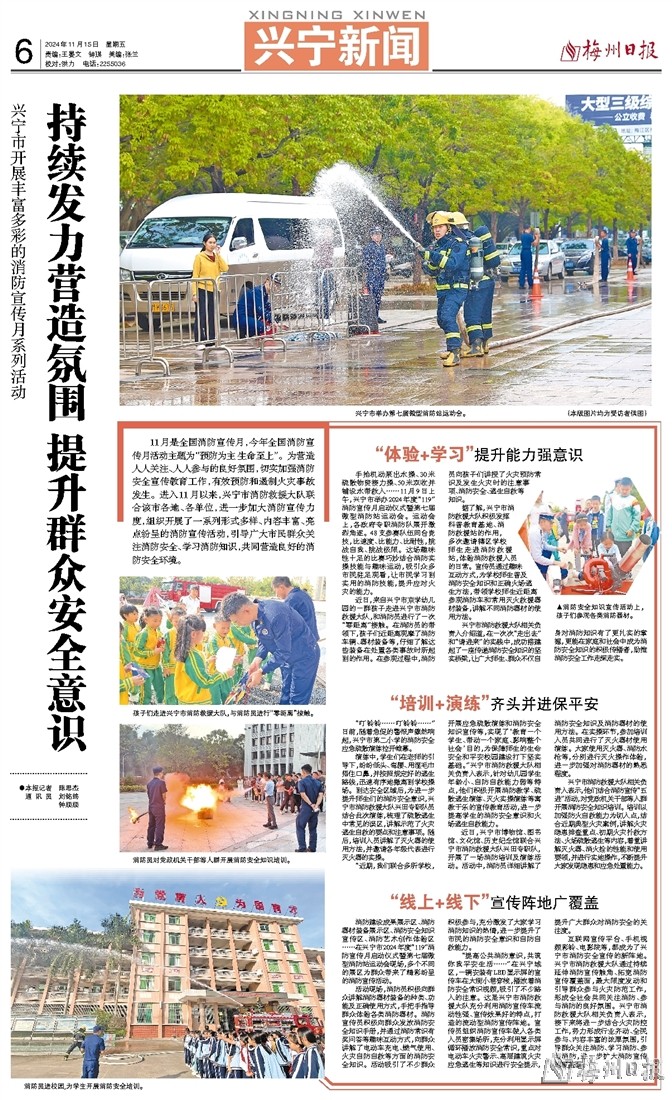 “近期,我们联合多所学校,开展应急疏散演练和消防安全知识宣传等,实现了‘教育一个学生、带动一个家庭、影响整个社会’目的,为保障师生的生命安全和平安校园建设打下坚实基础。”兴宁市消防救援大队相关负责人表示,针对幼儿园学生年龄小、自防自救能力弱等特点,他们积极开展消防教学、疏散逃生演练、灭火实操演练等寓教于乐的宣传教育活动,进一步提高学生的消防安全意识和火场逃生自救能力。