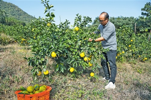 让人想不到的是,眼前这片丰收的“金山”,几年前还是一片荒山。“从2019年开始,我们通过租赁暗石村的荒山荒地,使用有机改土种植脐橙树约120亩,今年已是第5个种植年头,预计脐橙产量约20万斤、总产值超100万元。”蕉岭县鲜橙达企业负责人、暗石村“产业村长”庄正开摘下一颗脐橙介绍道,这里出产的脐橙圆润饱满、汁多肉嫩,吃起来橙味十足,上市后便深受市场青睐,今年还没正式开园便已收到了许多老顾客的订单。“我们主要通过线上渠道接单,将每天新鲜采摘的脐橙销往全国各地。而且每年都有众多游客前来果园体验采摘乐趣。今年我们11月15日开园迎客,诚邀游客来果园共享丰收喜悦。”庄正开笑着说。
