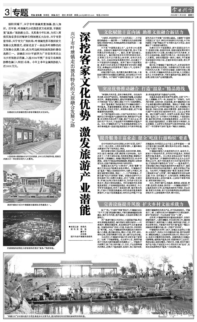 暖阳照耀下,兴宁市叶塘镇美景如画、游人如织。近年来,叶塘镇充分挖掘客家文化资源,不断拓宽“温泉+”旅游新业态。尤其是今年以来,为深入贯彻实施省委农村精神文明创建五大行动,兴宁市委宣传部、兴宁市文广旅体局、叶塘镇党委不断探索文旅融合发展模式,逐渐走出了一条独具叶塘特色的文旅融合发展之路,成为周边城市短途旅游的最佳选择之一。该镇在2023年被评为广东省休闲农业与乡村旅游示范镇,入选2024年度广东省文化和旅游特色镇(入库级)名单。今年上半年全镇旅游收入近5000万元。